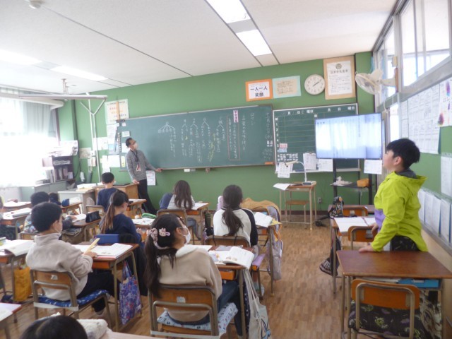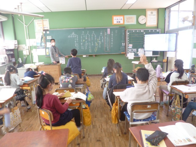 4年生国語「言葉の意味と使い方」の授業の様子です。普段使っている言葉の中に、1つの言葉でも2つの意味を持つことがあります。例えば、「ご飯」という言葉は、1つは、「炊いたお米のご飯」、もう1つが、「食事を意味するご飯」です。 ほかにも「日」や「山」などは、いろいろと使われています。同じ言葉でもいろいろと意味があっておもしろいと感じる授業でした。