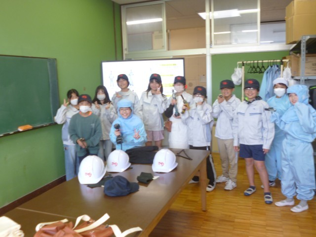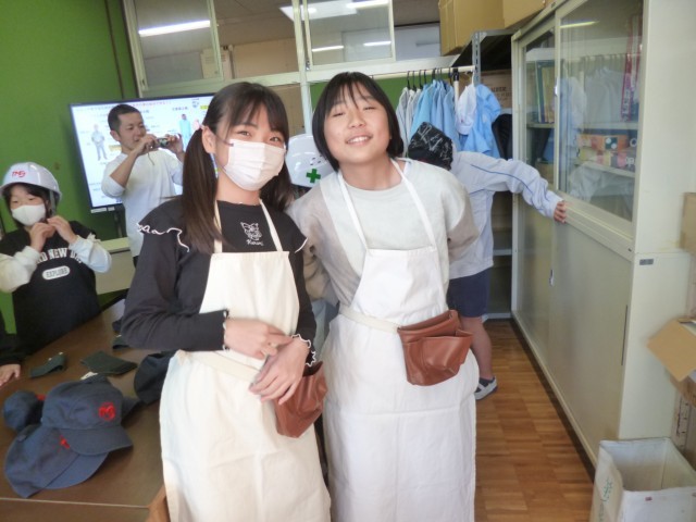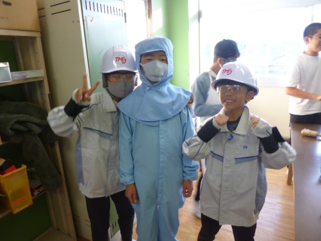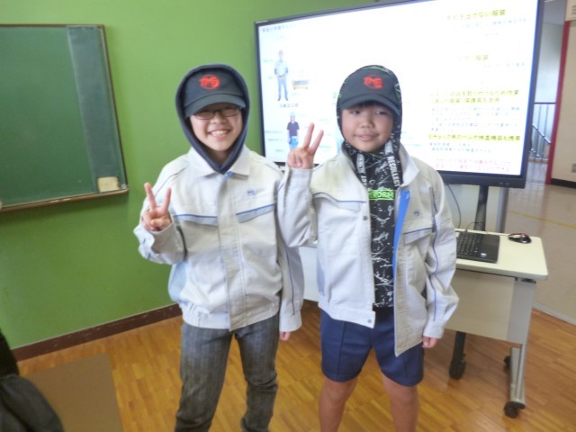 後半では、本物の作業着に着替えてみたり、作業工程の疑似体験をしたりしました。どの子も楽しんで取り組んでいました。それぞれの作業着を着てみて、作業がしやすいようにそれぞれが工夫されていることが分かりました。安全靴では、つま先に物が落ちてきても安全な仕組みになっていることも実際に履いてみて分かりました。