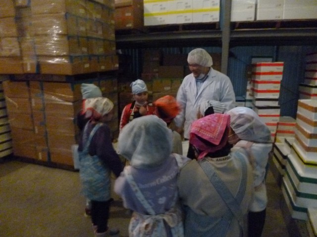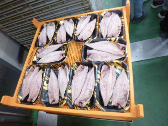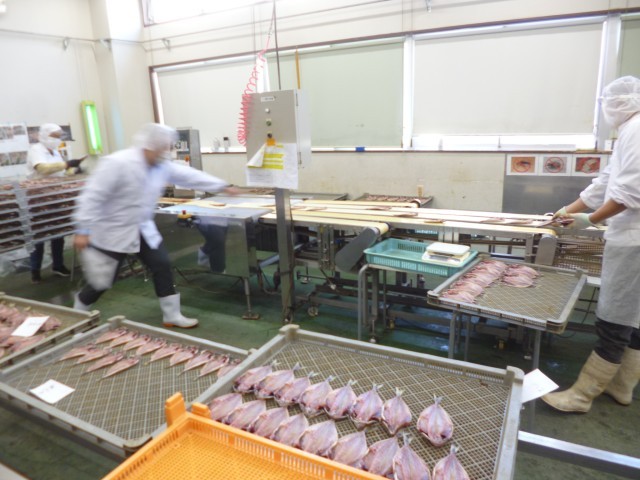 乾燥部屋に入れ終わった後は、大きさ・重さなど機械を使って選別していました。その後、マイナス20度の部屋で冷凍されて、パックに包装され、発泡スチロールに入れて、今度はマイナス30度の倉庫に冷凍保存された後に出荷されるとのことでした。実際にマイナス30度の部屋に入れていただき、ものすごく寒い体験もさせていただきました。