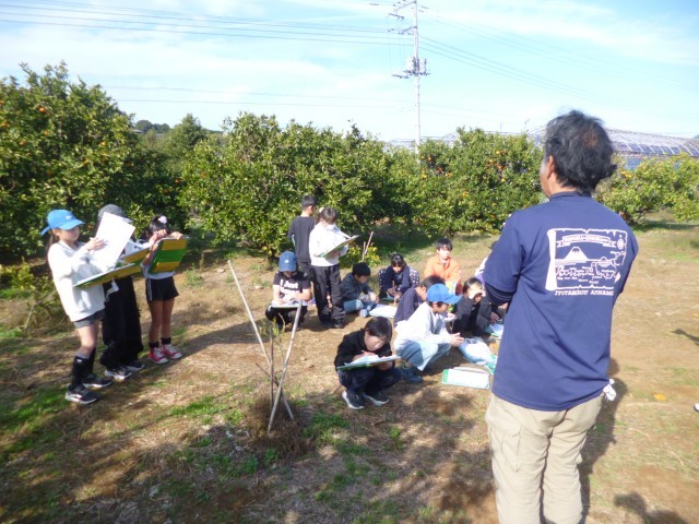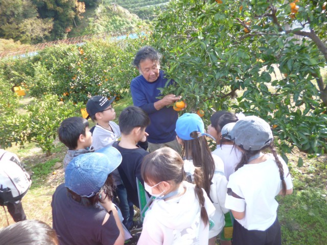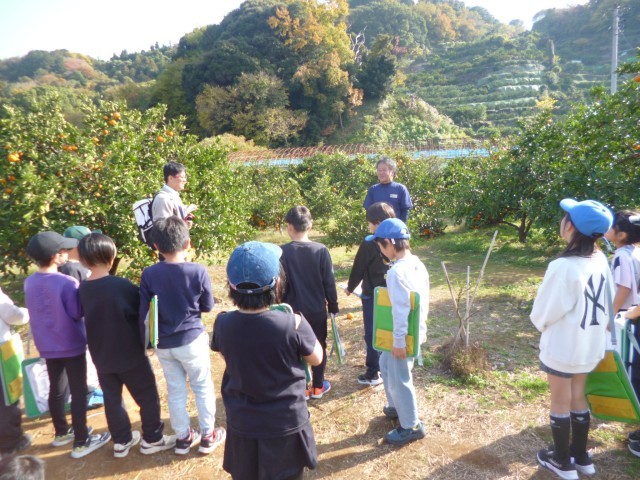 最後は、「木負みかん園」の見学です。ミカン栽培の方法や栽培しているミカンの種類などについて話をしていただきました。人気のあるミカンの種類やミカンの名前の由来、1本の木からどのくらいのミカンを収穫することができるのかなど、たくさんの質問にも1つずつ丁寧に教えていただきました。