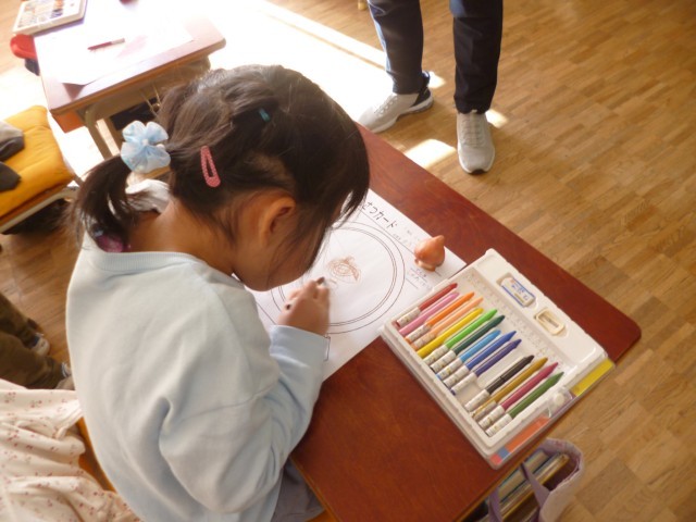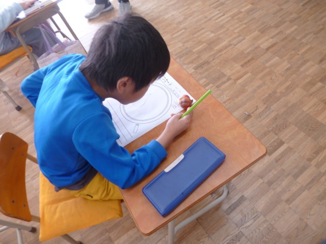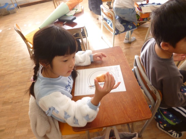 チューリップの球根の観察をしました。最初に球根を触ってみたり、いろいろな角度から見てみたりしました。それから観察カードにかきました。球根をよく見ながら、絵で描いたり、気づいたことを文が書いたりすることができました。