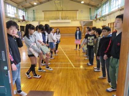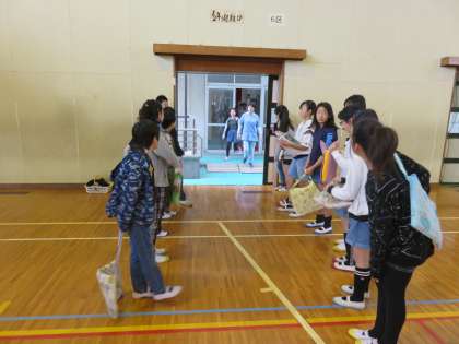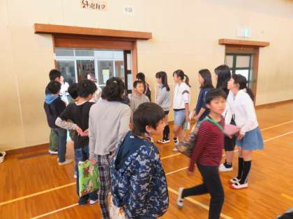 朝会前に、あいさつの花道を作って全校児童を迎えました。通る子たちも、みんな笑顔になっていました。