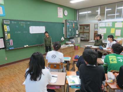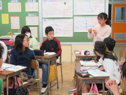 正多角形は全てが線対称な図形であることを見付けました。また、対称の軸の引き方を説明する場面では、一人の子の説明にみんなで付け足していき、フォローしあいながら説明を完成させました。