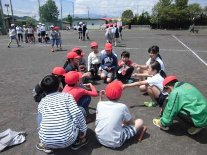 昼休みに赤赤、赤黄、白白、白青の2学年合同の4チームに分かれてリレーの練習をしました。さすが6年生、力強く迫力ある走りを見せてくれました。5年生も負けずに頑張っています。