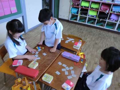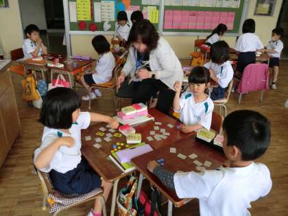 10までの数の学習の中で、今日は「どっちがおおきい?」の勉強でした。算数ボックスの中の数カードを使って、めくってどっちの数が大きいか競います。勝った子は相手の子からおはじきを1つもらいます。