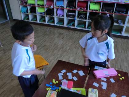 10までの数の学習の中で、今日は「どっちがおおきい?」の勉強でした。算数ボックスの中の数カードを使って、めくってどっちの数が大きいか競います。勝った子は相手の子からおはじきを1つもらいます。