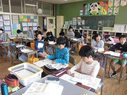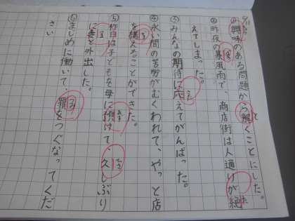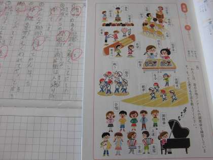 ここまでの新出漢字を、文章の中で使って練習しました。方眼のノートに心を込めて一生懸命書いていました。その後で、イラストの場面の様子を、熟語を使った文章を作って表現しました。習った漢字を使いながら覚えています。
