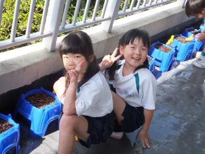 1年生は、朝、先生とスキルをやる子、朝顔の種に水をあげる子、読書をする子、それぞれの活動をがんばっていました。