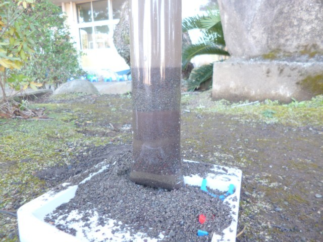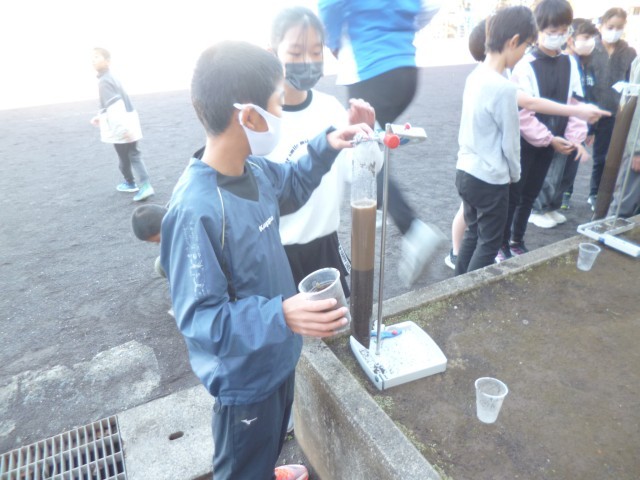 6年生理科「土地のつくりと変化」の授業の様子です。流れる水の働きによって、どのようにして地層ができるのかを実験で確かめました。堆積実験器を使って、泥や砂などを水の中に流し込みました。4~5回同じ作業を繰り返しました。泥や砂、礫(小石)の層が少しずつできていることに子どもたちは気づき、「水のはたらきで層ができること」「重いものが下の方、軽いものが上にいくことで層ができること」など、実験を通して理解することができました。
