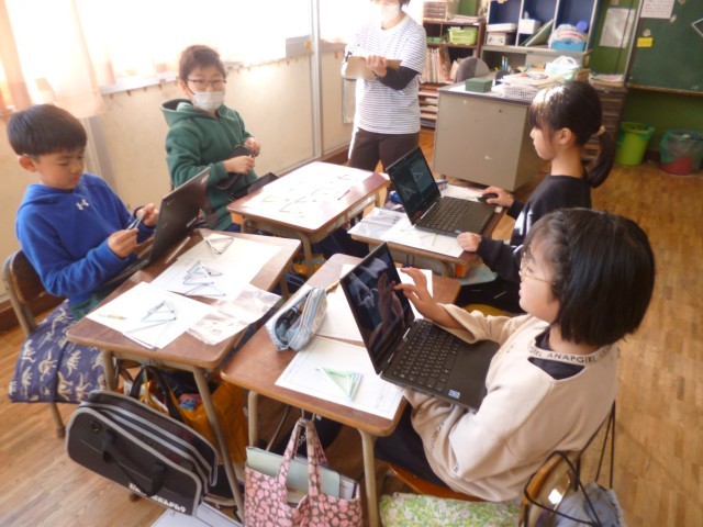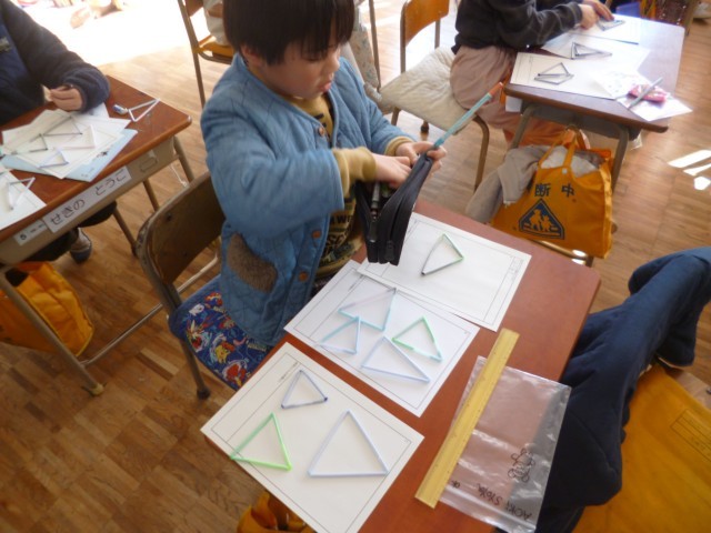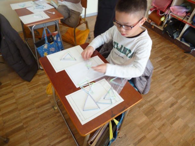 3年生算数「三角形と角」の授業の様子です。昨日の授業の時間に、3つの長さの違うストローを使って、三角形が何種類できるのかを学習し、全部で10種類の三角形を作りました。今日の授業では、その10種類の三角形を「どんな種類に分けられるかな」という課題に向けて、取り組みました。最初は自分で考えて、その後、班になって話し合いました。自分の考えをしっかりともって、三角形の仲間分けをすることができました。