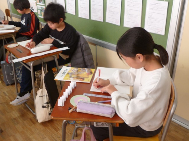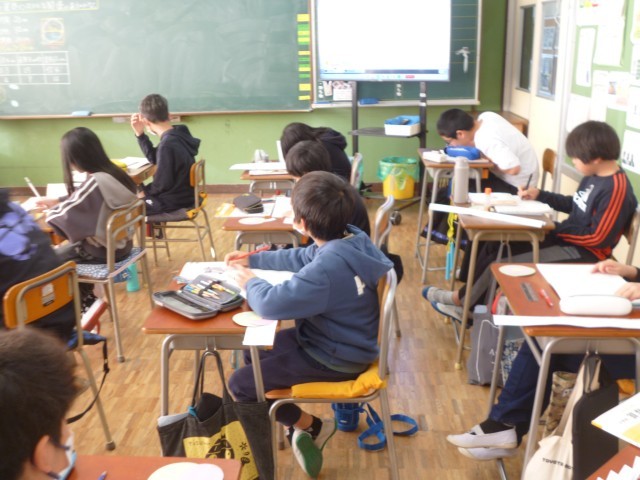 5年生算数「正多角形と円」の学習の様子です。円周率について調べてみました。円周の長さを直径の長さで割っていました。いくつかの円を調べてみると、割り算の答えがある程度同じような答えになり、子どもたちからは、「あれ、同じになった」「さっき計算した出した数字と似ている」など、驚いていました。円周率が自分たちの計算を根拠に求めることができました。