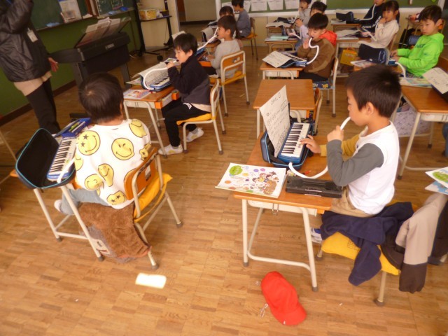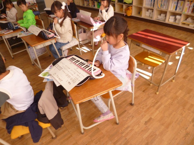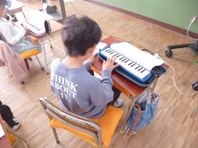 1年生音楽の授業の様子です。鍵盤ハーモニカがどんどん上達してきています。一人ずつ音をつなげながらみんなで曲を完成させました。順番に自分の前に弾いているこの音をよく聞いて、演奏することができます。上手に弾くことができるようになって、嬉しそうでした。