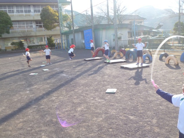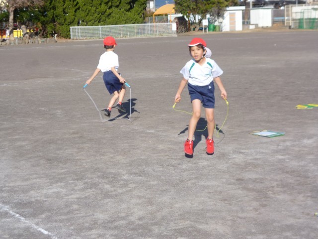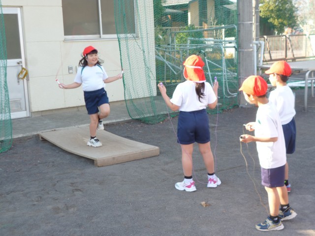 2年生体育の授業の様子です。なわとびをたくさん練習しました。なわとびカードを使いながら、少しずつ跳べる技が増えてきています。ジャンプ台も使いながら、二重跳びにも挑戦している子が多くいました。