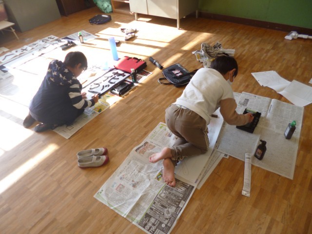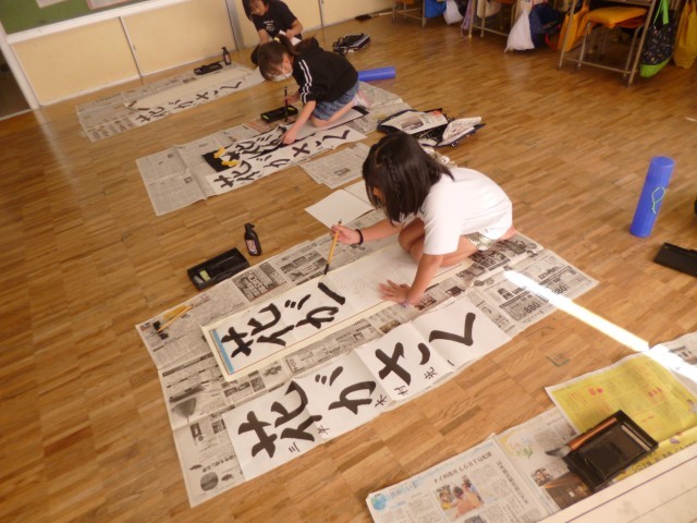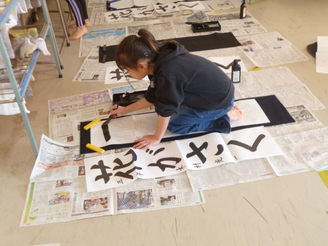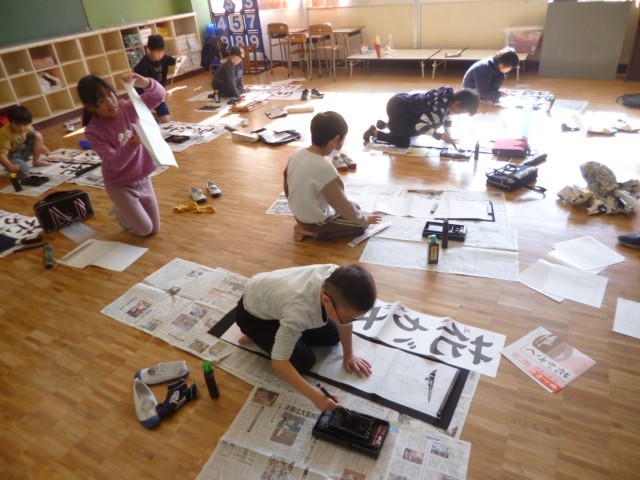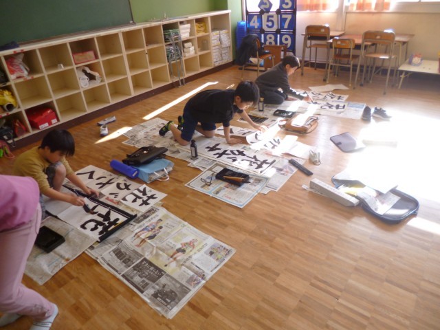 3年生書写の授業の様子です。書き初めの練習を、教室、多目的室、ろうかを使って、書き初めの練習をしました。床いっぱいに広がって書くことができたので、のびのびとした字を書くことができました。「花がさく」の文字が練習を繰り返すごとに、とても力強くなりました。