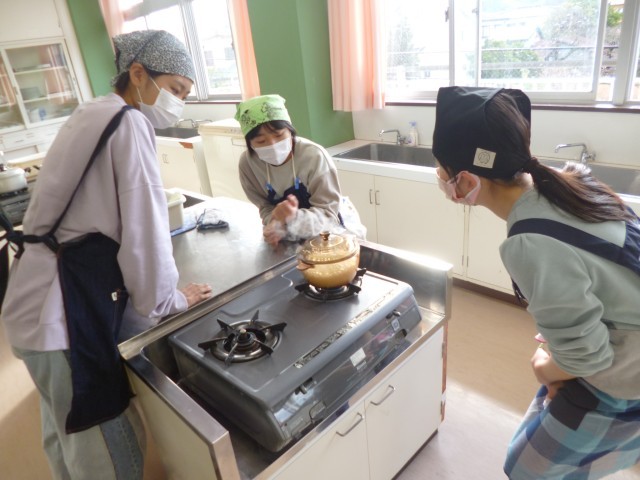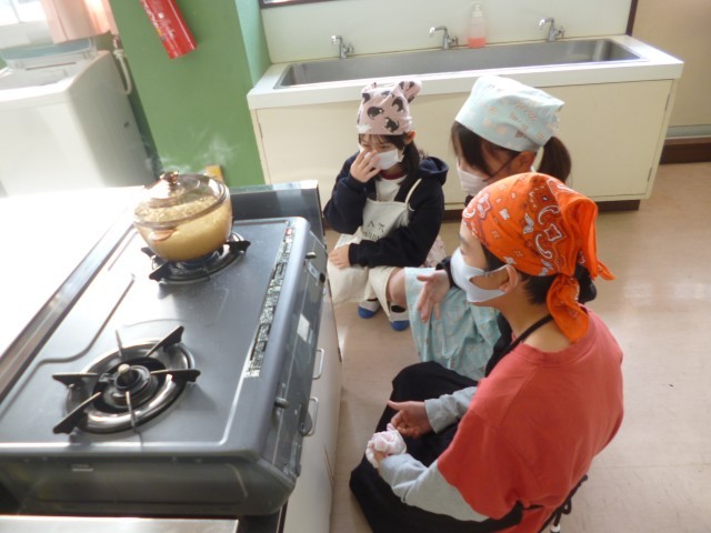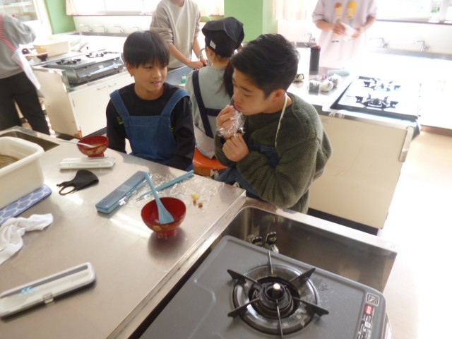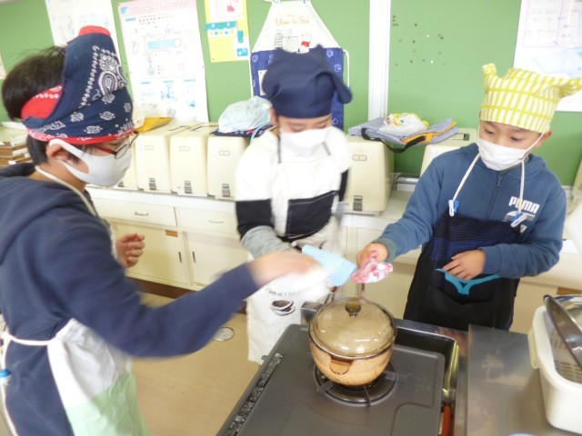 5年生家庭科の授業の様子です。「ご飯とみそ汁」を作りました。最初にお米をはかって、洗います。次に、水をはかり、30分くらい吸水をします。そして、お米を炊きます。沸騰するまで2~5分強火にします。中火で5~7分、水が引いたら10~15分弱火にします。最後に10分くらい蒸らします。手順をしっかりと確認しながらご飯を炊きました。また、みそ汁も作りました。本日は、給食がないので、ご飯もみそ汁もたくさん食べることができました。