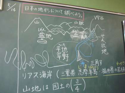 日本の地形の特色について調べました。山地が国土の四分の三をしめること、川は高い山から流れ出し、急流で短いことを学びました。「ミシシッピ川はアメリカだよ。」「ロワール川は、フランスだ。」「信濃川は日本で一番長い川だ。」など、またまた地図帳で川探しクイズをして楽しみました。動画「岐阜県海津市の輪中」を視聴してこれから学ぶ、低い土地のくらしの予習をしました。
