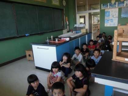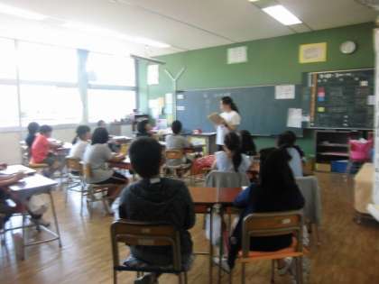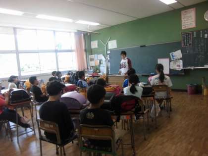 赤階段を上って、上の階の学年の児童から引き取り、青階段を降りて、下駄箱に向かいます。