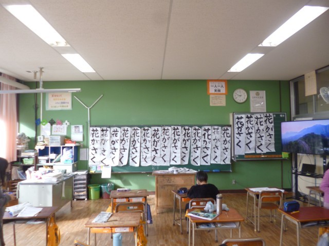 子どもたちが書いた書き初めを廊下に掲示しました。3年生は、「花がさく」、4年生は「水の流れ」、5年生は「光る大地 」、6年生は「四季の美」です。書き初め、力いっぱいに元気よく書けていました。