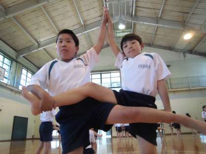 運動会の最後を飾る組体操の練習です。今日は、6年生に教えてもらいながら、2人技3人技の完成度をあげるべく練習に取り組みました。「今日で3つの技ができるようになったよ。」と嬉しそうに話す子もいました。お家での練習が実を結んだようです。声を掛け合って安全に技ができるようにしています。