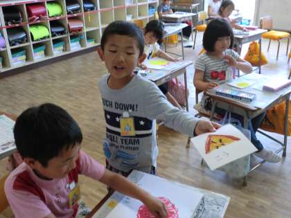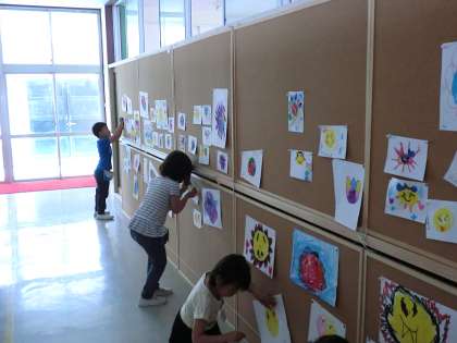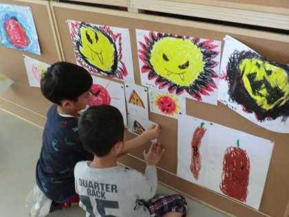 「かっこいいおひさまが描きたいな。」「スイーツみたいなおひさまにしたいな。」「カラフルなおひさまにするよ。」と、どの子もとっても意欲的にがんばりました。描いたおひさまは、さっそく自分で飾ります。飾る場所も、自分が好きなところにしました。