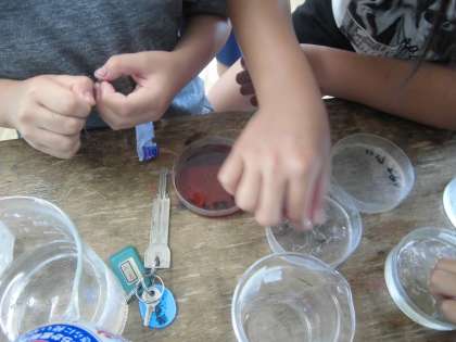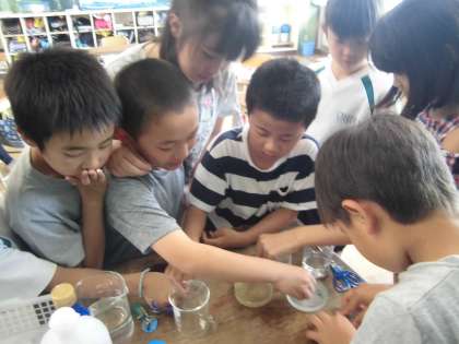 国語の説明文の学習で、あめんぼが表面張力によってうくことができることがわかりました。今日は、針金のあめんぼを作成し、実際にあめんぼのうく秘密を体験しました。