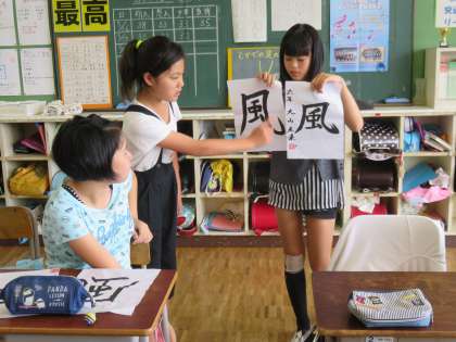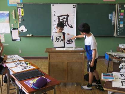 毛筆「風」の清書です。書き終えたら、一番最初に書いた自分の字と比べてみました。全員が、上手になっていることを実感できました。