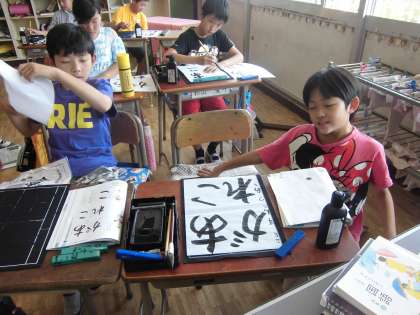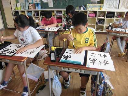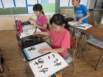 5時間目の書写の時間には、毛筆で「あこがれ」と書きました。穂先の動きと点画のつながりを意識して書きます。始めて四文字を一枚に書きました。「この あ はうまくいったのに他の字がうまくいかなかったな。」「れの字の最後は、し みたいに書くんだ−。」などなど、お手本を見ながら真剣に取り組みました。あこがれの的となるような美文字が書けたかな?