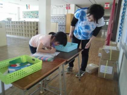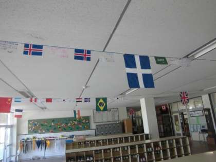 児童玄関に、万国旗が登場しました。