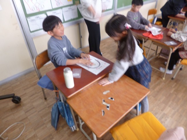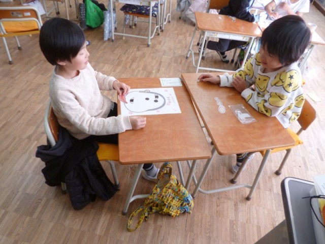 1年生がふくわらいに挑戦しました。ペアで行いました。目や耳、鼻などを1つずつ渡されて、顔の台紙に乗せていきます。ペアの友達が「上、上」「もう少し右、いや下、下」などの言葉を聞いて、ふくわらいを完成させていました。いざ目を開けてみると、「あっ」と驚く顔に、笑い声が上がっていました。