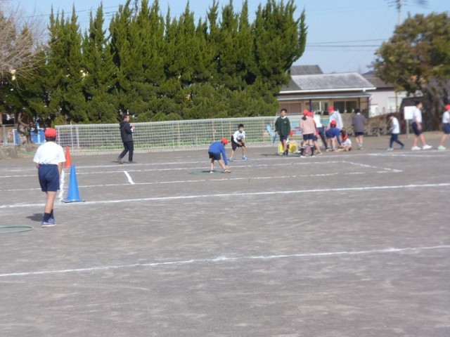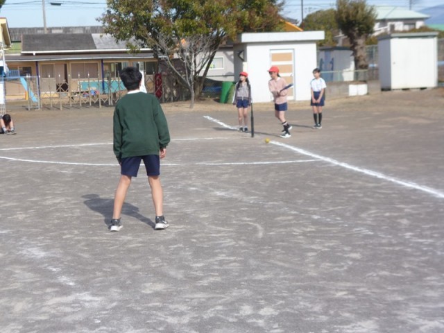 5年生体育の授業の様子です。バッティング練習や守備練習をした後、チームに分かれて、ゲームを行いました。攻撃チームがボールを思いっきり打ちます。守りのチームはボールを一生懸命、捕りに行きます。ボールを捕り終えたときにどこまで進んでいるかで得点が入ります。打つ方も守る方も一生懸命です。