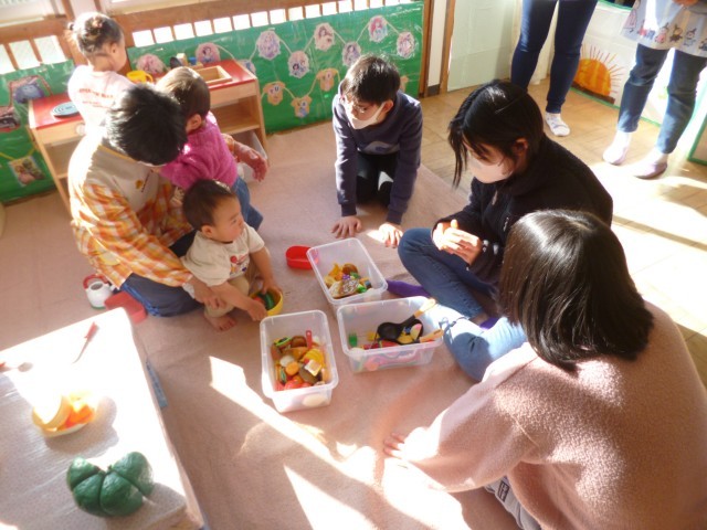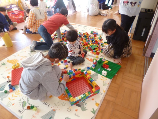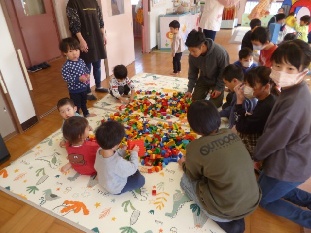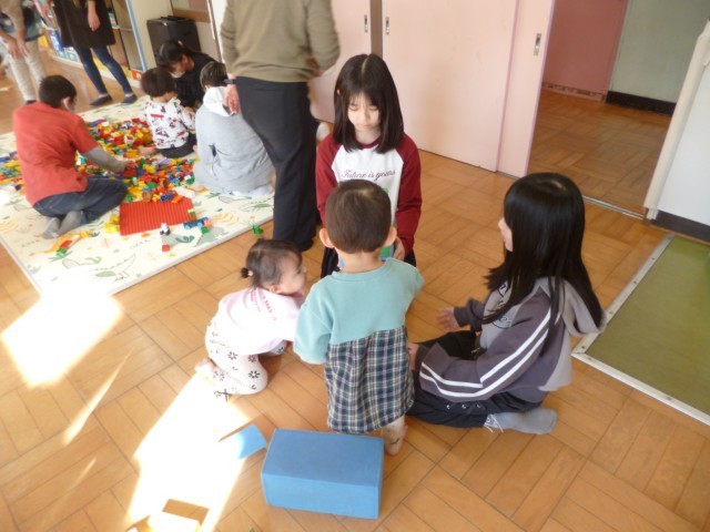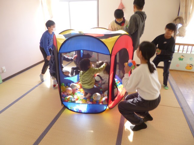 続いて、部屋を変えて、遊びタイムとなりました。遊びタイムでは、部屋の中でいろいろな遊びが準備されていました。積み木のブース、レゴブロックのブース、ボールプールのブース、おままごとのブースなどがあり、園の子どもたちが好きなところで遊んでいるところに5年生が一緒になって遊びました。園の子たちも5年生もとても楽しそうに遊んでいました。 とても癒やされる時間でした。