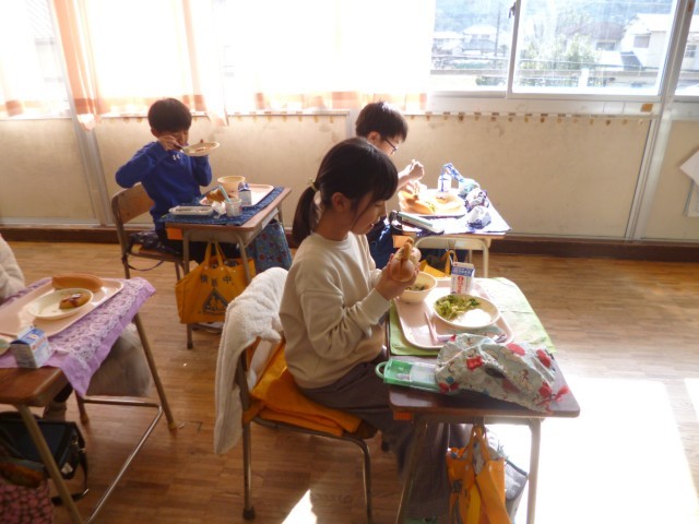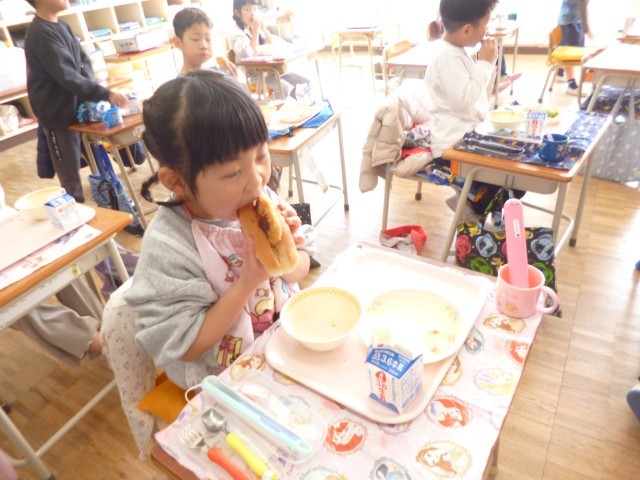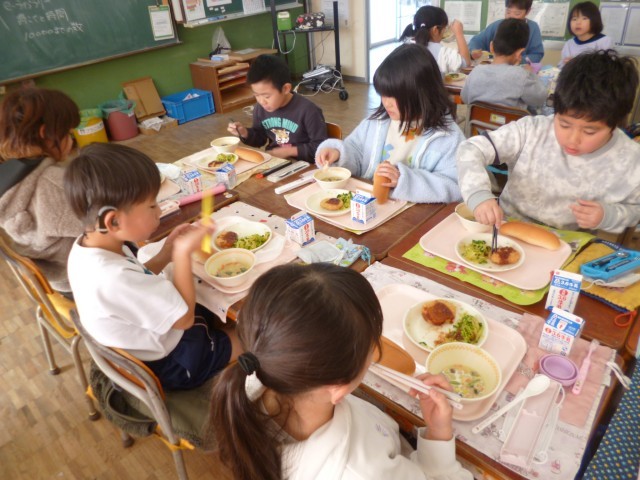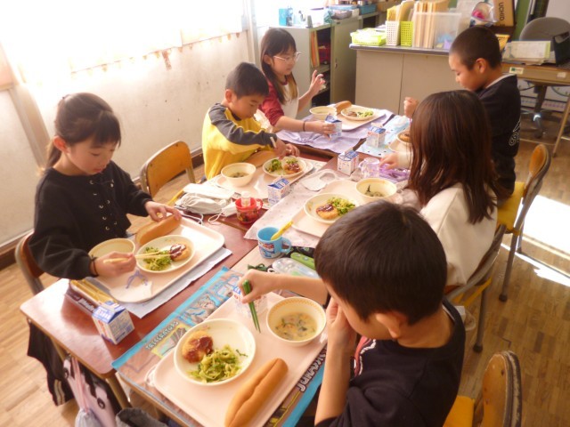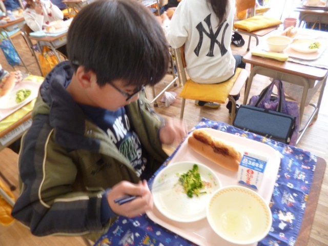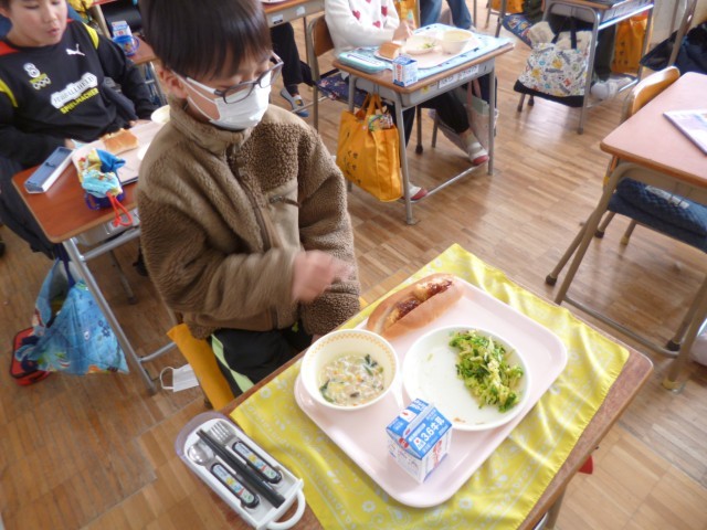 1月24日から30日まで、全国学校給食週間となっております。昔は、パンの日が多かったようです。今日の献立は、「コッペパン」「牛乳」「野菜コロッケ」「特製ソース」「ボイルドサラダ」「ミルクスープ」でした。子どもたちは、コッペパンに野菜コロッケやボイルドサラダを挟んで、コロッケパンにして、おいしそうに食べていました。