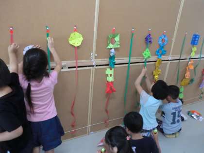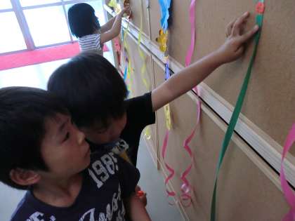 作った飾りは、「おひさまろーど」が飾ってあった廊下に掲示しました。「今度は何ロードって名前にしようか?」と投げ掛けると、「かざろーど!!」という返事がありました。ちょっと気の利いたネーミングを発見して、子どもたちはうれしそうでした。