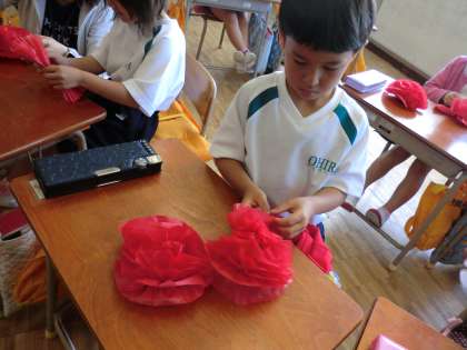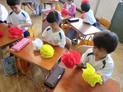 運動会のとき、1年生にはお世話係の4・5年生が付いてくれます。今日は係のお姉さんたちのお手伝いで、お花づくりをしました。一枚ずつ花びらを開いて、とっても上手に作れました。
