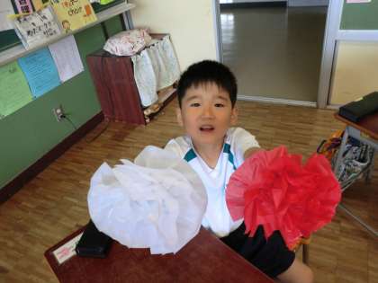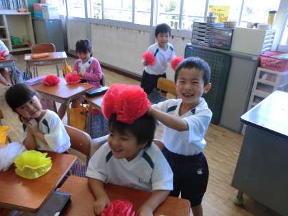 できあがったお花がきれいで、とてもうれしかったようです。頭の上に乗せたり、友達に見せたりして、とても楽しそうでした。