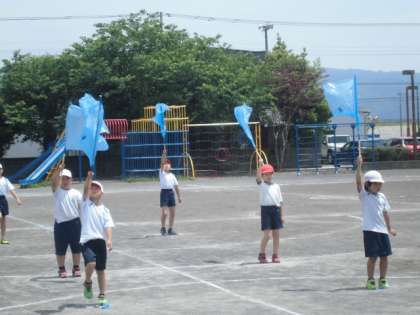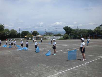 4年生・3年生は、青い旗を使った表現「ぼくらの地球は魅力的!」の練習をしています!