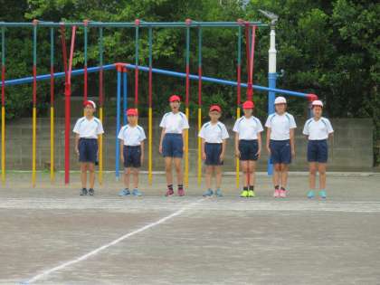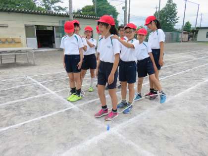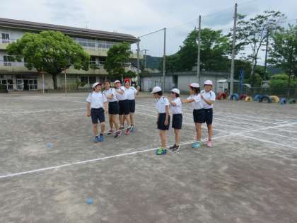 組体操の口上を、運動場の端と端で声を出し合いました。少しずつ大きな声が出せるようになり、本番に向けていい練習ができました。