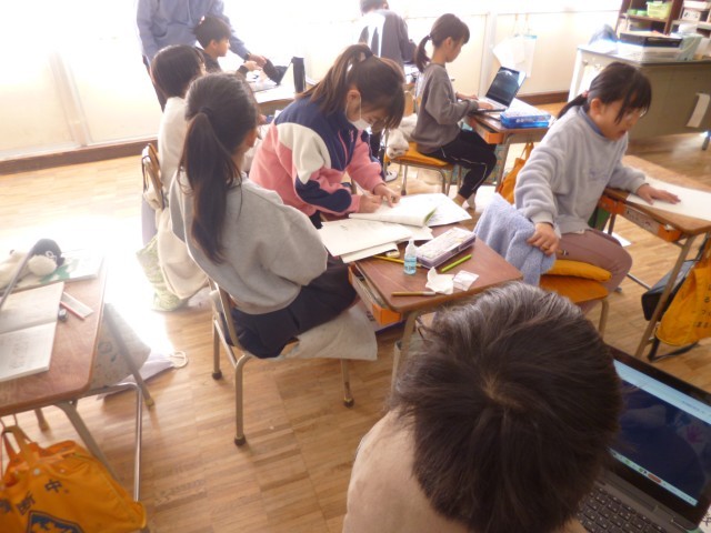 3年生算数の授業の様子です。「3けた×2けた」のかけ算の求め方について考えました。まずは、これまで学習してきたことを生かして、自分で求め方を考えました。なかなか考えが浮かばない子は、友達と一緒に考えました。ノートに求める方法を書いた後、Chromebookで写真にして撮り、画面に写して、いろいろな考え方を共有しました。