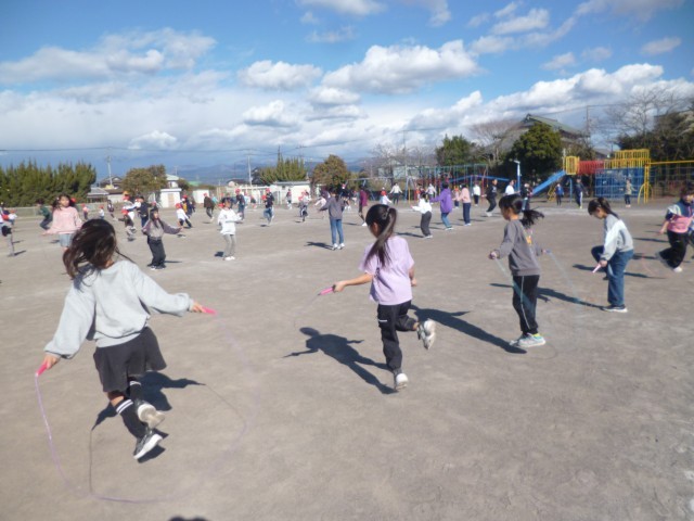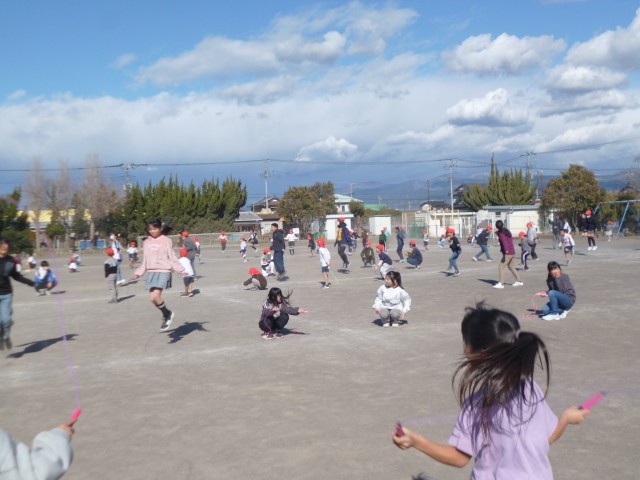 昼休みに、体育委員会企画「第2回なわとびコンテスト」が行われました。ペアの子と協力してのコンテストです。第2回は、1・2・3年生は、片足跳び、4・5・6年生は二重跳びを行い、どのくらい跳び続けられるかを競いました。今回も最後の3組になるまで行われました。1回戦、2回戦が行われ、最後まで跳び続けた子は、2年生、3年生の多くいました。2回戦目では、高学年で二重跳びを最後まで跳び続ける子がいて、本当にすごかったです。
