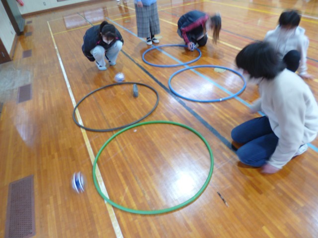「スクローラ」が完成した子から、体育館に移動して、実際に走らせてみました。広い体育館、床に置いた「スクローラ」が走り始めました。思っているよりも速く進んでいきました。壁や障害物に当たると方向転換をしたり、くるくると回ったりとおもしろい動きをしました。フラフープに置くと、その周りを回っていました。