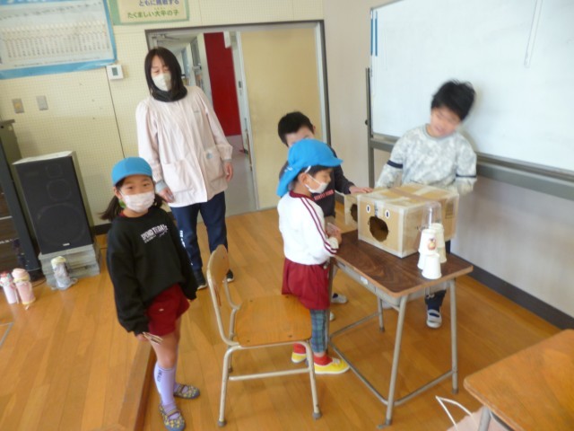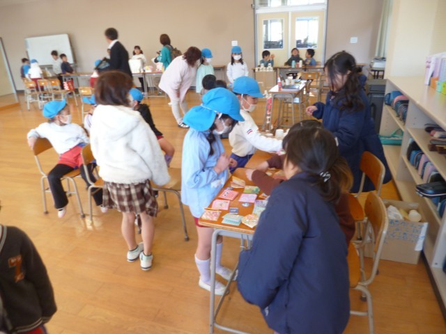 1・2年生が第2校時に、こども園の年長さんが大平小学校に来て交流会を行いました。年長さんたちも4月から大平小学校に通ってくる子が多くいます。前半は、音楽室で2年生が生活科の授業で作ったおもちゃでいろいろと遊びをしました。それぞれお店を出して、お客さんを呼び込みます。年長さんたちは、いろいろなお店で、遊びを楽しみました。2年生もしっかりとルールを説明し、年長さんたちに楽しんでもらうことができました。