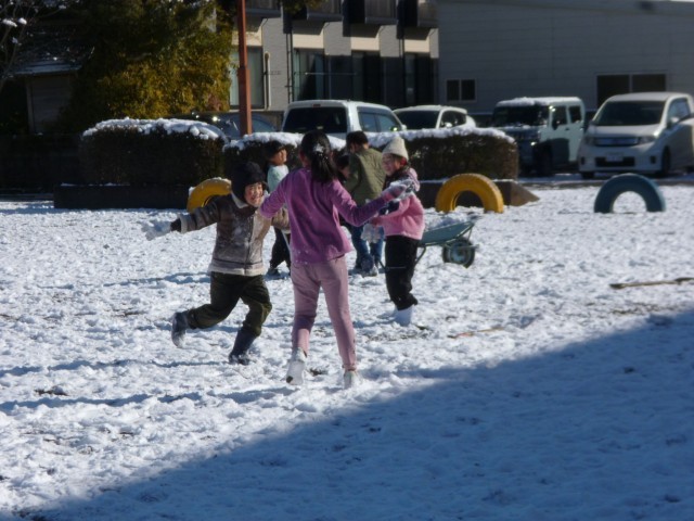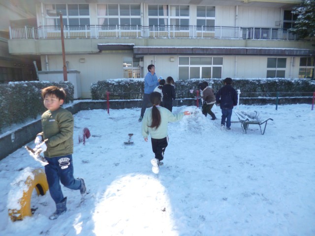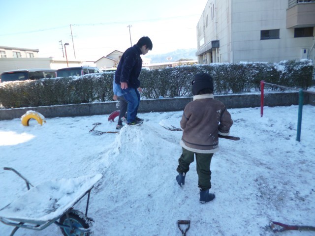 3年生も同じ2時間目に運動場に出てきて雪遊びをしました。3年生も雪でたくさん遊んだ後、すべり台づくりをしました。一輪車を使って、雪をたくさん集めました。集めた雪を坂道にして、お塩を使って、固めました。でも、なかなかすべるまでのすべり台を作るのは・・・難しかったです。