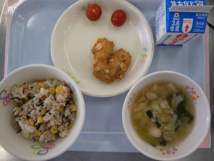 コーンとひじきのピラフ 牛乳 ホキのアーモンドフライ ミニトマト うずらたまごのスープ