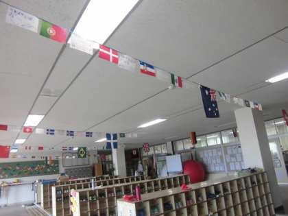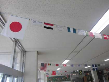 児童玄関には、万国旗と子どもたちの目標が、掲げられています!!