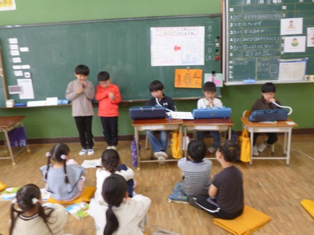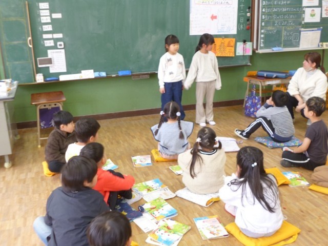 1年生の授業の様子です。明日の参観会で今年1年間頑張ってきたことをグループごとに発表します。最終確認も兼ねて、リハーサルを行いました。国語グループ、生活科グループ、体育グループ、音楽グループ、それぞれ準備バッチリです。明日、保護者の方に見てもらうのが楽しみです。