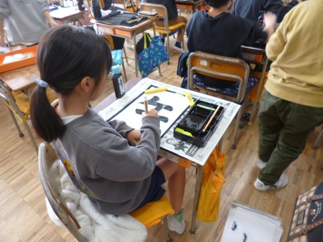 3年生書写の授業の様子です。「午」の文字を書きました。筆の入り方や左払い、止めなどを意識しながら書きました。書写の授業は3年生からですが、だんだん筆遣いが上手になり、バランスのよい字を書くことができるようになってきました。