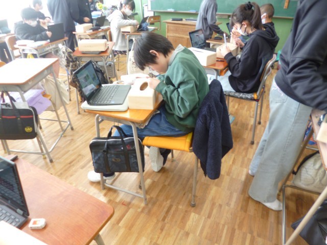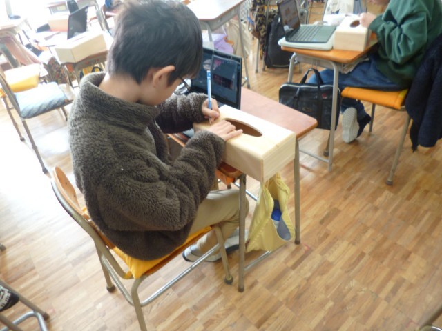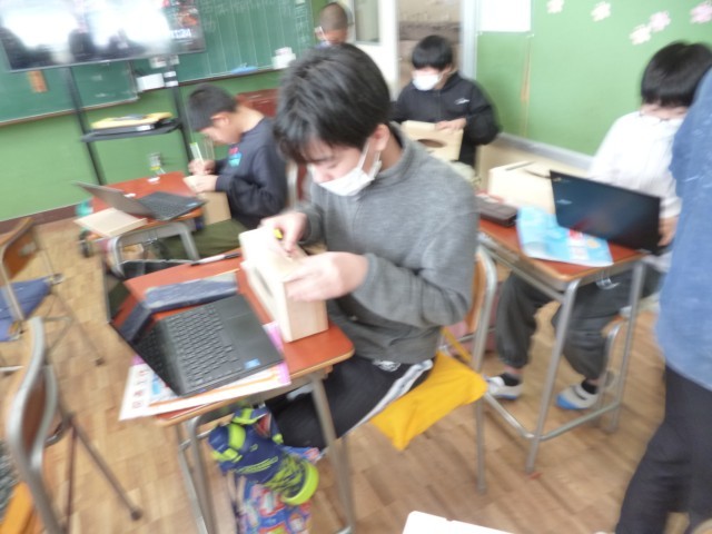 6年生図画工作科の授業の様子です。卒業制作として、ティッシュケースの制作をしています。ティッシュケースに、自分の好きな絵を描いています。小学校生活の思い出のこと、習い事のスポーツのこと、好きなものなど、オリジナルのティッシュケースになるように、楽しみながら制作していました。