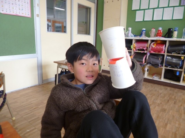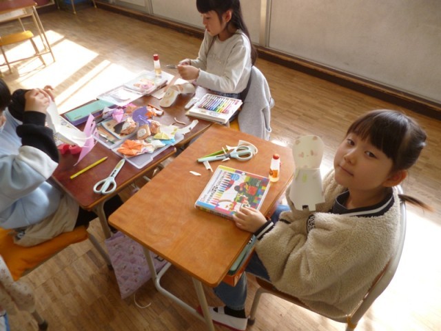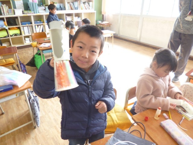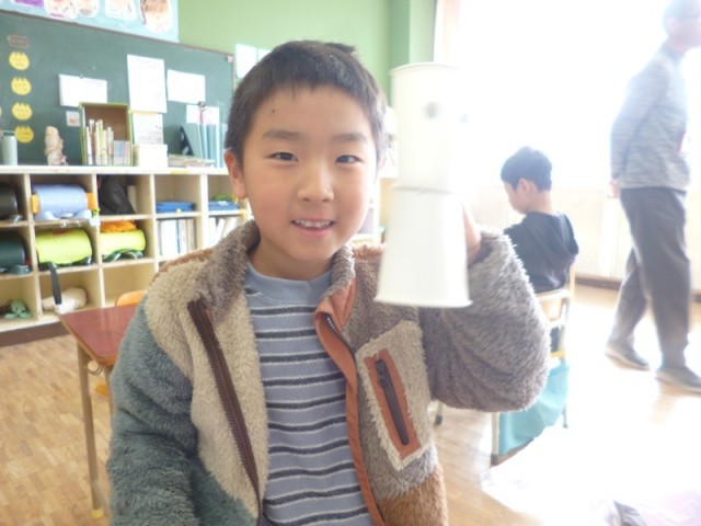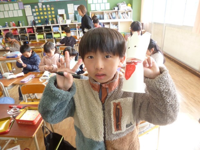 1年生図画工作科の授業の様子です。紙コップを半分に切って、つなぎ合わせて作ります。子どもたちは、自分の想像を膨らませて、作品を作っていました。好きな動物の顔を作っている子、おばけのような顔を作っている子などどれも、オリジナルにあふれてとてもかわいい作品ができました。