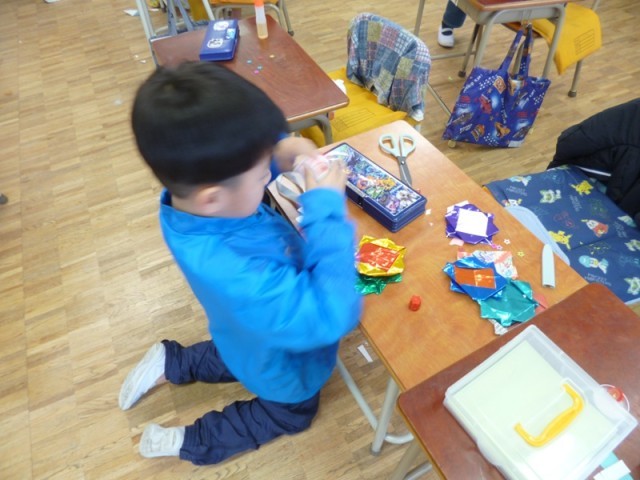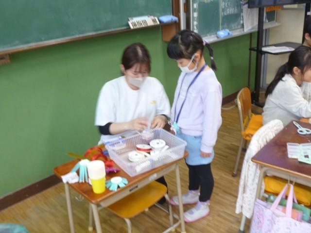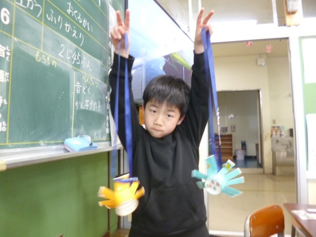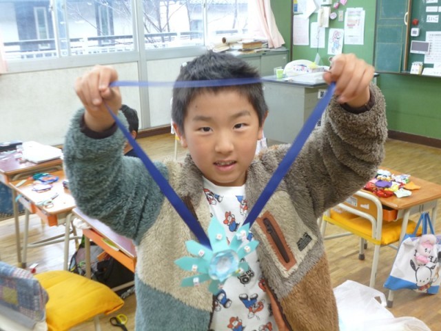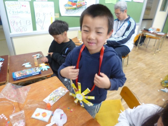 1年生が6年生に送る会に向けて、メダルのプレゼントを作っています。ペアのお兄さん、お姉さんをイメージしながら、かわいらしい、かっこいいメダルを作っています。6年生を送る会では、このメダルを首からかけて、6年生に喜んでもらえるのが、楽しみです。