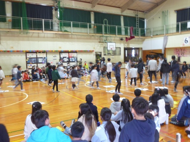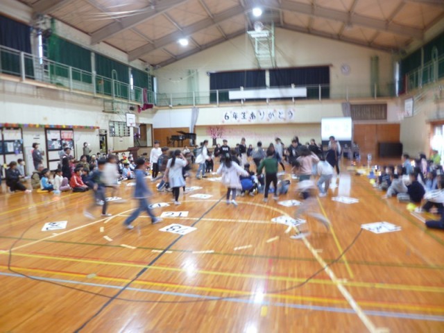 続いて、2年生。2年生の学習では、かけ算九九を一生懸命に覚えた記憶があります。そこで、2年生とはかけ算対決。かけ算の問題が出て、その答えのカードを取ります。お互いに問題が出た後、走り出しカードをゲット。前半は2年生がリード・・・。しかし後半は6年生が巻き返し、終わってみると9対6で6年生の勝利でした。2年生、あと一歩でしたね。でも、がんばりました。